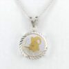 This 1/10 oz .999 fine silver coin pendant has a sterling silver bezel. The sterling silver wheat chain is 18″. The coin is .999 fine silver with 24k plating on part of the image.