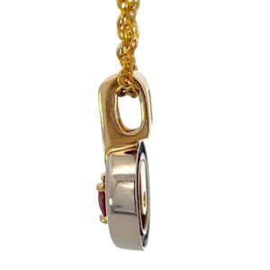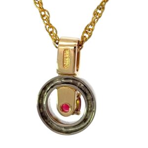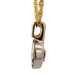 This estate pendant features a .70 round red spinel stone with .20 carats of SI clarity diamonds mounted in a 14k 2-tone yellow and white gold mounting. It weighs 5.4 grams and is just over 3/4 inch tall overall. This pendant comes with a gold plated chain at no charge, we have a nice variety of gold chains if you need one.