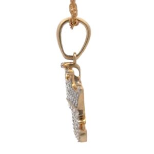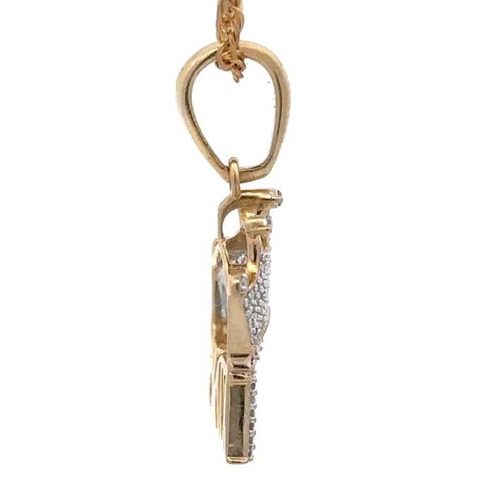 This estate pendant features “KING” with a crown over the word. It is mounted in a 3.2 gram 10k setting. It is approximately 25mm tall and 18mm wide. This piece comes with a gold-plated display chain.