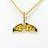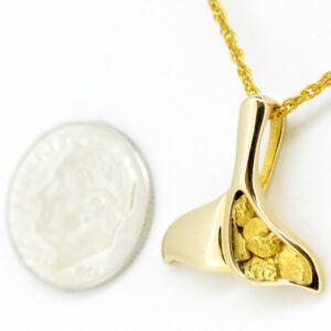 This gold nugget 14k whale tail pendant is set in 14k yellow gold. The Alaskan gold nugget is overlayed on one side of the tail. The pendant comes with a gold plated chain in a nice box. It shows up ready to give to someone special, even if that special someone is you.