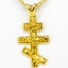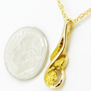 This gold nugget pendant is approximately 22 x 6 mm. Three gold nuggets are soldiered onto a 14k mounting and a gold plated chain is included.