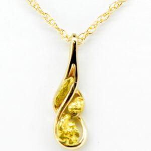 This gold nugget pendant is approximately 22 x 6 mm. Three gold nuggets are soldiered onto a 14k mounting and a gold plated chain is included.