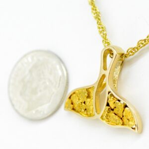This gold nugget whale tail has gold nugget overlay on both tails. 14k gold mounting. A gold plated chain is included.