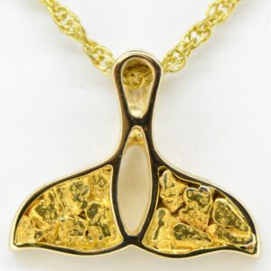 This gold nugget whale tail has gold nugget overlay on both tails. 14k gold mounting. A gold plated chain is included.