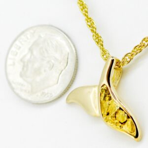 This gold nugget whale tail pendant is set in 14k gold. The Alaskan gold nugget is overlayed on the right tail. The pendant comes with a gold plated chain in a nice box. It shows up ready to give to someone special, even if that special someone is you.