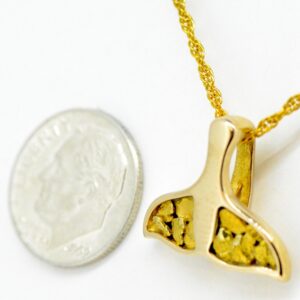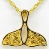 This Alaskan whale tail gold nugget pendant is set in 14k gold. This pendant features gold nugget overlay on both sides of the whale tail.