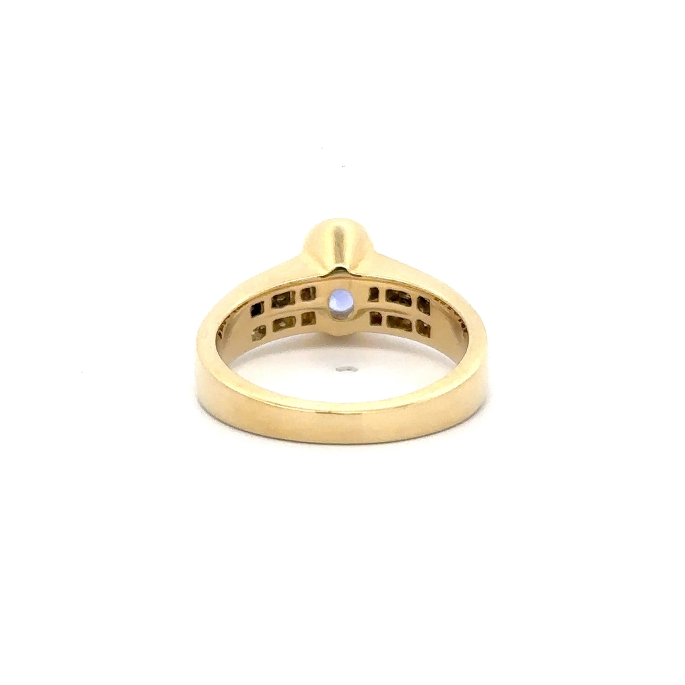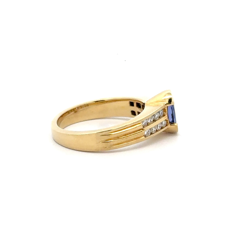This ladies estate ring features a .95 carat tanzanite, surrounded by .36 ct. of diamonds, clarity S-I and color H-I-J. It is mounted in 6.8 grams of 14k yellow gold. Ring size 6 3/4.