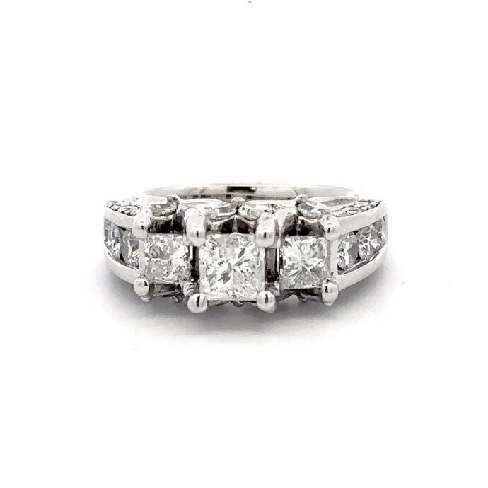 This lady’s estate ring features princess, round, and marquise shaped diamonds totaling 2.00 carats. Clarity SI2-I and color H-I. It is mounted in 7.7 grams of 14k white gold. Ring size 4 3/4.