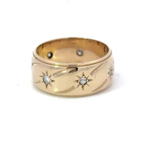 This lady’s estate gold & diamond band features a total of .18 carats of diamonds mounted in a 14k yellow gold band weighing 6.8 grams. Ring size 6 1/2.