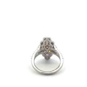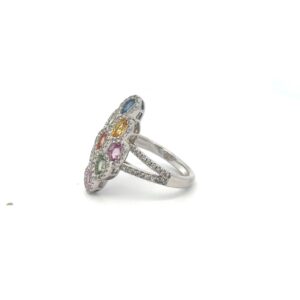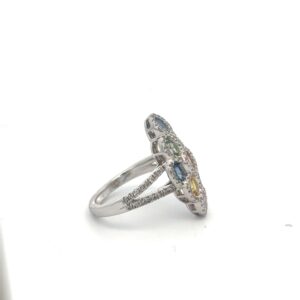 This lady’s estate ring features 2.0 carat in multicolor sapphires, surrounded by .50 ct. of diamonds, clarity S-I and color G-H-I. Mounted in 6.9 grams of 14k white gold. Ring size 7.