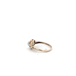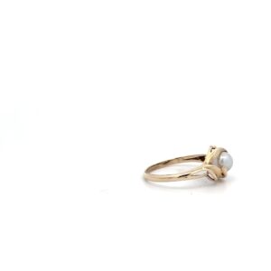 This lady’s estate ring features a natural pearl. It is mounted in 1.6 grams of 14k yellow gold. Ring size 5 1/2.