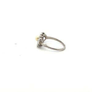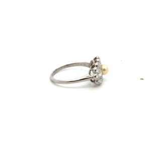 This lady’s estate ring features a 4 mm pearl, surrounded by .80 ct. of diamonds, clarity VS-SI and color G-H-I. All mounted in 3.6 grams of platinum. Ring size 6 1/4.