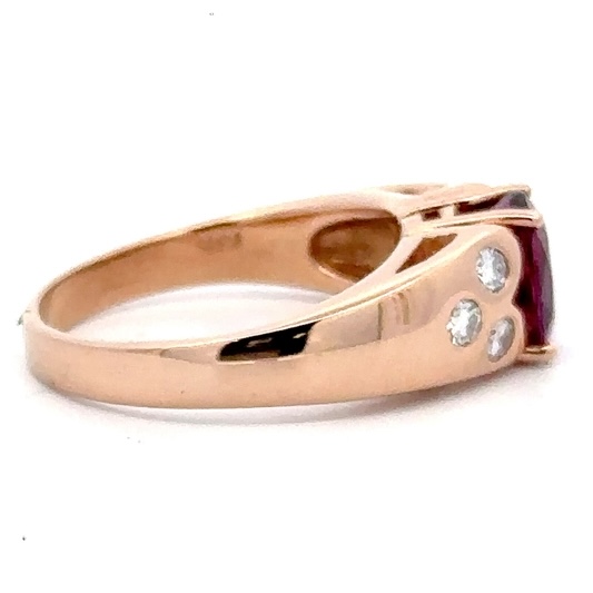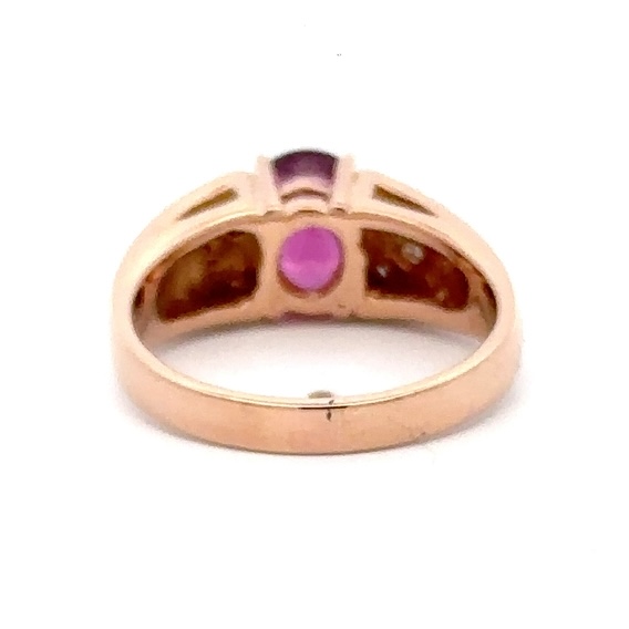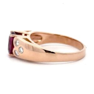 This lady’s estate ring features a 2.20 carat garnet, accompanied by .24ct of diamonds, clarity VS, and color G-H-I. It is mounted in 7.1 grams of 14k rose gold. Ring size 7.75.