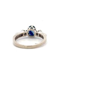 This lady’s estate ring features a 1 carat sapphire, and .20 ct. of diamonds, clarity I and color H-I . Mounted in 14k white gold. Ring size 6. Weight 2.8 grams.
