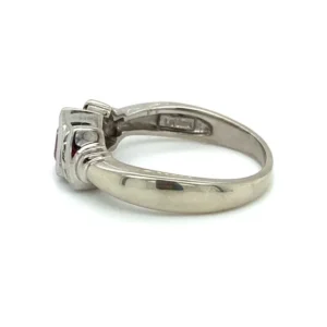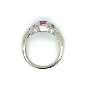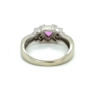 This pink sapphire & diamond ring is a beautiful piece to add to your collection. Pink sapphire total weight: .65 ctw. Diamond total carat weight: .12 ctw, Diamond color: G-H, Diamond clarity: VS. 14k white gold. Ring size 6.