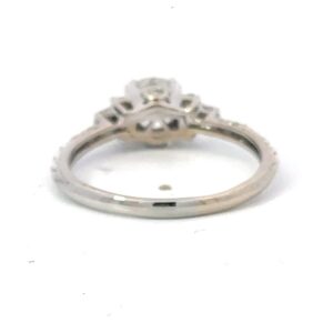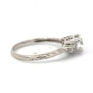 This beautiful white gold solitaire ring features a natural SI2-J color 1.02 carat center diamond with 1/4 carat in accent diamonds. These are mounted in 3.5 grams of 18k white gold that has hand-engraved details. Ring size 9.5