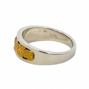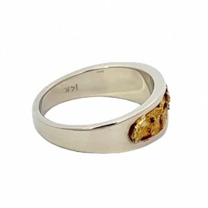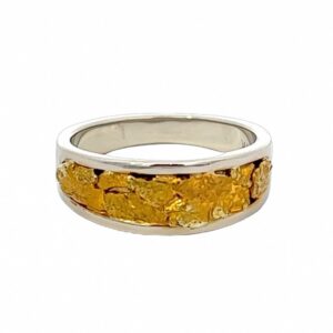 This gold nugget 14k white gold ladies ring is expertly crafted with natural gold nuggets carefully placed and soldered into 14k white gold mounting. Because we are using natural gold nuggets, each ring is one-of-a-kind. The ring tapers from about 7mm at the top down to about 3mm on the bottom. Ring Size: 6
