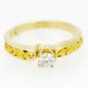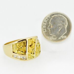 This men’s gold nugget & diamond ring is set in 14k gold. The ring features Alaskan gold nuggets with three diamonds on each side. This one of a kind ring comes in a nice box. It shows up ready to give to someone special, even if that special someone is you.