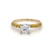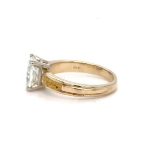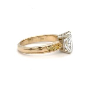 This 2.10ct lab-grown diamond lady’s ring is crafted from 14k yellow gold. The ring features natural Alaskan gold nuggets and a 2.10 carat lab-grown center diamond mounted in a nice 4-prong setting that is very strong and secure. This handmade ring weighs 4.2 grams. Ring Size: 6.25.