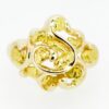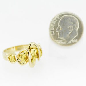 This ladies gold nugget ring is set in 14k yellow gold. The ring features five natural Alaskan gold nuggets. The ring comes in a nice box. It shows up ready to give to someone special, even if that special someone is you.