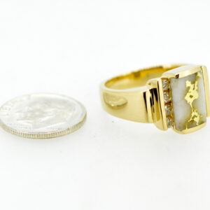The ring features a natural gemstone known as “Gold Bearing Quartz,” typically mined from deep underground. In most cases, gold found in quartz exists in microscopic amounts, making it virtually invisible. However, this ring boasts an extraordinary rarity as it showcases a very scarce stone that is first cut into slabs, revealing the precious gold vein. Skilled artisans cut, shape, polish, and mount the gold quartz into a 14k gold setting. Embrace the allure of this remarkable Gold Bearing Quartz ring and celebrate the natural beauty of this exceptional gemstone.