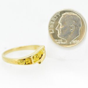 This is a modern version of the classic Alaskan gold nugget wedding band. A channel of natural gold nuggets on one side and polished gold on the other. 14k polished yellow gold and natural nuggets, great for everyday wear.