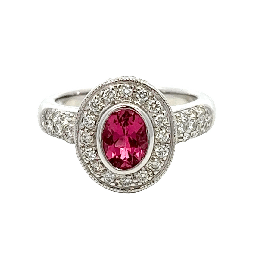 Check out this stunning pink tourmaline estate ring! A truly captivating ring that combines elegance and sophistication. This timeless ring makes a statement with its stunning gemstones and exquisite craftsmanship. This lady’s ring features .80 carat pink tourmaline and diamonds that total 1.38 carats. 18k. The ring is about 1/2″ long at the top. Ring size 6.5.