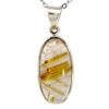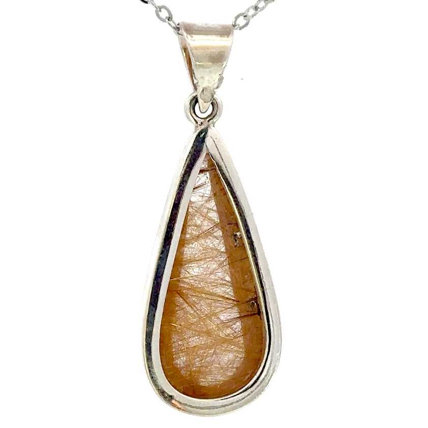 Rutilated quartz is a kind of quartz that contains fine, needle-like strands of rutile running through it. These strands can appear gold, silver, or reddish, giving each stone a unique, thread-like pattern. The quartz itself is usually clear or lightly tinted, which helps highlight the delicate internal structures. Each pendant will have its own unique shape and color.