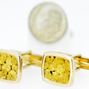 These gold nugget cuff links are a unique set to add to your collection. The Alaskan natural gold nuggets are mounted on a 14k gold base with 14k gold filled wingback findings. The cuff links come in a nice box. They shows up ready to give to someone special, even if that special someone is you.