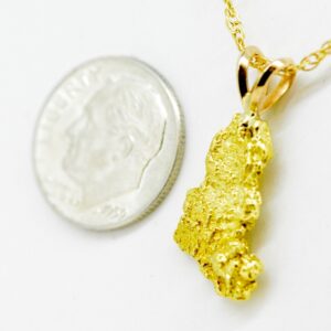 This 1.6 DWT Alaskan gold nugget pendant weighs 1.6 DWT and features a classic 14k split bail. The pendant comes with a gold plated chain in a nice box. It shows up ready to give to someone special, even if that special someone is you.
