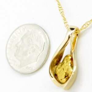 This 2.2 DWT Alaskan gold nugget pendant weights 2.2 DWT and features a classic 14k bail. The pendant comes with a gold plated chain in a nice box. It shows up ready to give to someone special, even if that special someone is you.