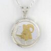 This 1/4 oz .999 fine silver coin pendant has a sterling silver bezel. The sterling silver rope chain is 20″. The coin is .999 fine silver with 24k plating on part of the image.