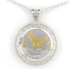 This 1/4 oz .999 fine silver coin pendant has a sterling silver bezel. The sterling silver rope chain is 20″. The coin is .999 fine silver with 24k plating on part of the image.