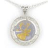 This 1/4 oz .999 fine silver coin pendant has a sterling silver bezel. The sterling silver rope chain is 20″. The coin is .999 fine silver with 24k plating on part of the image.