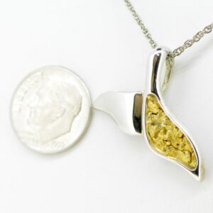 This pendant features natural gold nuggets soldered into a silver whales tail setting, approximately 27mm wide and 29mm high. Whether you love whales or this is just a very nice reminder of your cruise, it’s a great piece. Mounting it in silver helps show off the rich color of the gold against the silver background, and it also keeps the price lower. These gold nuggets make very interesting, one of a kind jewelry. They will definitely be conversation starters. Because the nuggets are natural, the nugget shapes will vary. The photo shown is a sample piece. It comes with a silver plated chain and mounted in a gift box. Photos are enlarged to display detail.