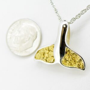 This pendant features natural gold nuggets soldered into a silver whales tail setting, approximately 26mm wide and 20mm high. Whether you love whales or this is just a very nice reminder of your cruise, it’s a great piece. Mounting it in silver helps show off the rich color of the gold against the silver background, and it also keeps the price lower. These gold nuggets make very interesting, one of a kind jewelry. They will definitely be conversation starters. Because the nuggets are natural, the nugget shapes will vary. The photo shown is a sample piece. It comes with a silver plated chain and mounted in a gift box. Photos are enlarged to display detail.