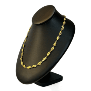 This beautiful chain is 23″ long and is made of natural gold nuggets linked together with 14 karat yellow gold loops and a 14k yellow gold claw clasp. We had to search through a lot of gold nuggets to find similar sizes, shapes, color and texture. The total weight of this handmade “Alaskan Chain” is 48.5 dwt / 75.4 grams, almost 2.5 troy ounces! We can add to the length of this chain if necessary, give us a call for more information at 1-907-278-8414.