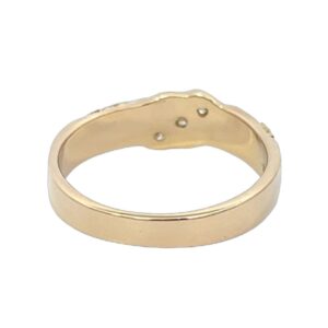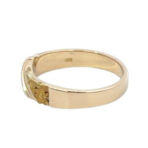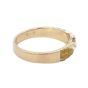This men’s 3 diamond gold nugget ring is set in 14k yellow gold. The ring size is 10 1/2. The ring comes in a nice box. It shows up ready to give to someone special, even if that special someone is you.