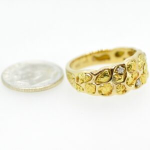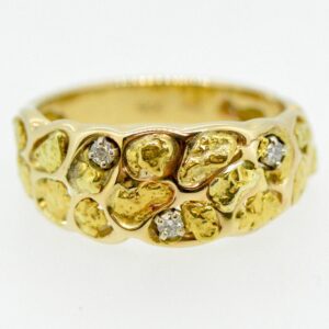 Men’s gold nugget ring set in 14k gold setting. Diamonds .09 ct total weight.