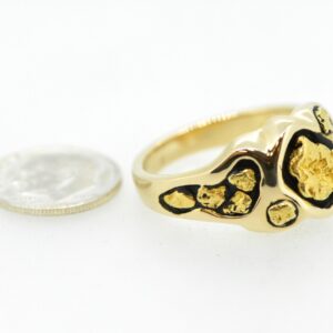 Men’s gold nugget ring set in 14k yellow gold. Approximate weight is 10 DWT. Varies with each unique nugget.