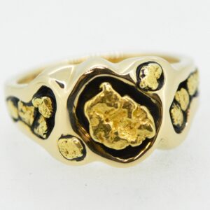 Men’s gold nugget ring set in 14k yellow gold. Approximate weight is 10 DWT. Varies with each unique nugget.