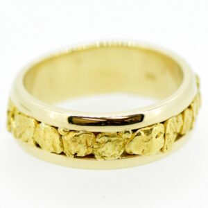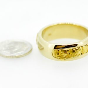 Men’s 14k ring set with natural gold nuggets. Our jeweler, Mark Castagnoli, specializes in solid, heavy weight men’s items. This ring is 8.5mm wide, size 13, and weighs 11.1 dwt.