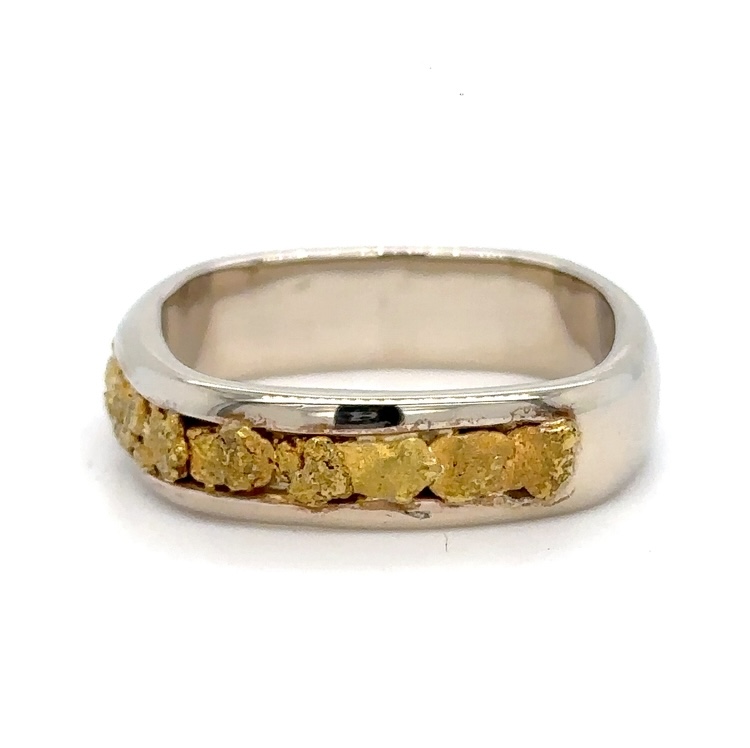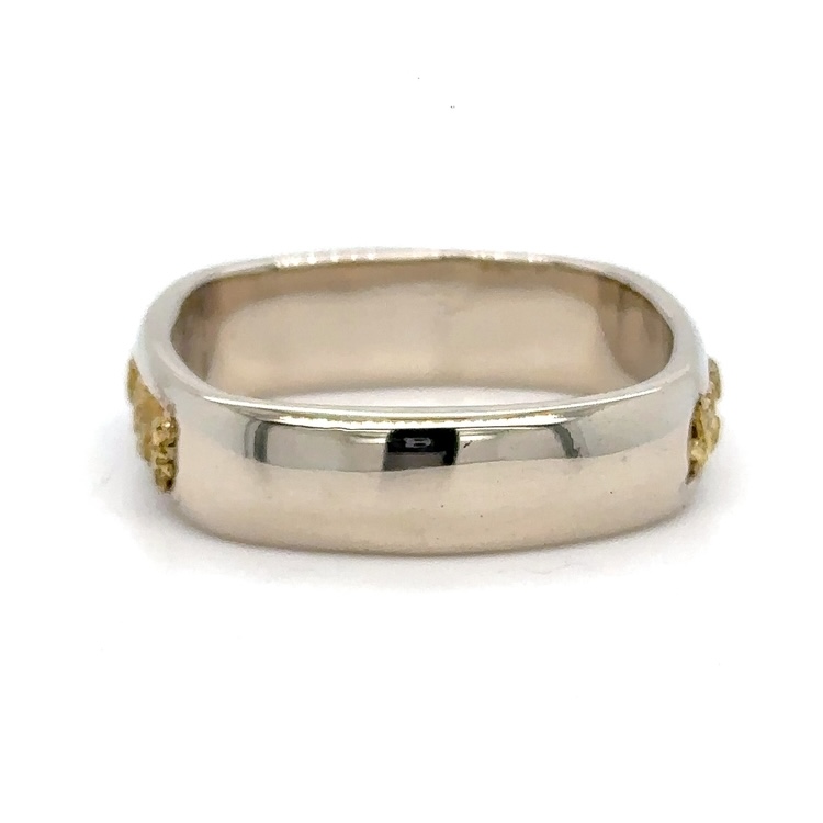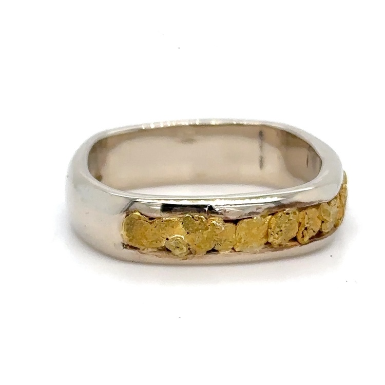 This white gold men’s ring with gold nugget is expertly crafted with natural gold nuggets carefully placed and soldered onto a 14k white gold band. Because we are using natural gold nuggets, each ring is one-of-a-kind. The ring is about 6.5mm wide and weighs 12.7 grams. Mark, the jeweler, makes many of his rings in a square shape, which is more comfortable than the traditional round shape for many men. Ring size 14. Due to the shape of the ring, it can only be sized larger or smaller about 1 size, otherwise we can make a new one in your correct size, please contact us for a quote.