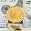 This gold money clip features a genuine United States $10 gold piece that was minted in 1901 and is in very nice condition. The mounting is 14k yellow gold with natural Alaskan gold nuggets inlayed below the coin. These money clips are available with original $5, $10, and even $20 gold coins.