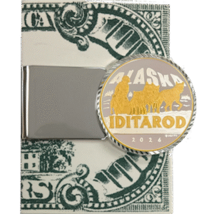These money clips feature our 2026 Official Iditarod medallions in 1 oz or 1/4 oz. gold relief. We protect the front of the medallion with an epoxy coating and they come packaged in a nice gift box.