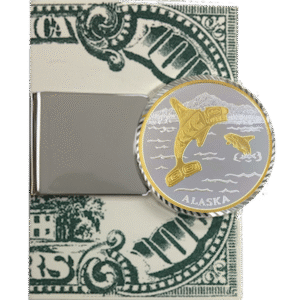 These money clips feature our beautiful Totemic Orca medallions. They are available with either a 1/4 or 1 oz. gold relief medallion. We protect the front of the medallions with an epoxy coating and they come packaged in a nice gift box.