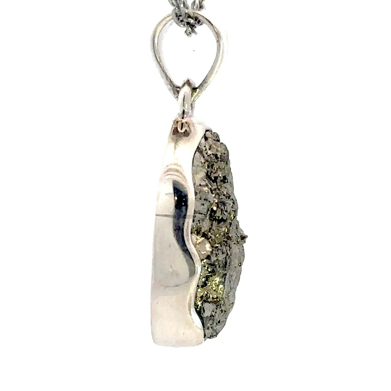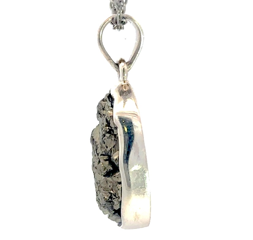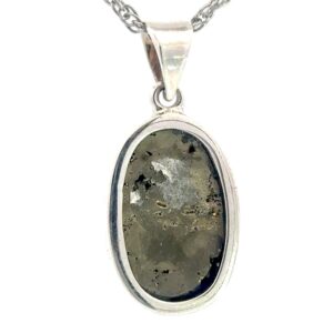 Pyrite, often called fool’s gold, with Sterling silver creates a striking contrast between raw, golden sparkle and smooth, polished shine. The rugged, natural look of pyrite pairs beautifully with the refined elegance of sterling silver. The natural stone in each pendant makes the pieces unique and different from each other.