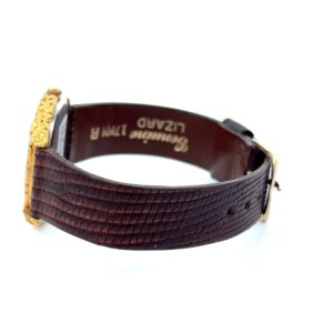 This gorgeous Seiko Alaskan gold nugget watch is covered with Alaskan gold nuggets and is a nice, sleek design that is classy while not being too flashy or gaudy. It is nice and slim and has a low profile while you are wearing it. This watch face is on a nice leather watch band, which gives it a nice two-tone look while also keeping the cost down compared to a full nugget watch band. If you purchase this beautiful piece, in the notes, put black or brown for the color of the watch band that you would like, and we will try to accommodate.