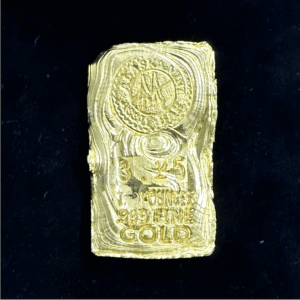 If you love gold, this is for you, and it is shockingly heavy! This 24 karat pure gold assay bar weighs 3.25 ounces, it is almost 2 inches tall, just over 1 inch wide, and nearly 1/4 inch thick. We pour them right here in our workshop in downtown Anchorage. The entire process is done in house, from cutting the different mold designs, melting and pouring the metal, then weighing and stamping the information into each bar. This makes every bar unique and no two bars will look exactly the same. We pour gold bars from 2 ounces and up, call us for more information 907-278-8414.