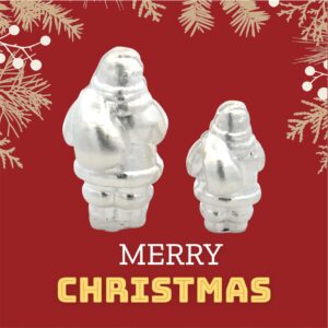 These Standing Santa assay bars are a perfect stocking stuffer and come in 2 sizes. The smaller one is about 1.5″ tall and weighs just over 1.5 ounces, the larger one is over 1.75″ tall and weighs almost 4 ounces of pure .999 fine silver! These 3-dimensional molds are tricky to pour and cost a little bit more for us to make.